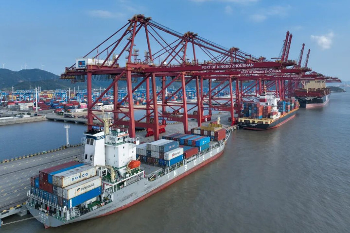 在宁波舟山港金塘港区大浦口集装箱码头,船舶进行集装箱装卸作业。新华社发(邹训永摄)