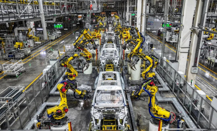位于重庆市两江新区的赛力斯汽车超级工厂拍摄的自动化生产作业现场。新华社记者王全超摄